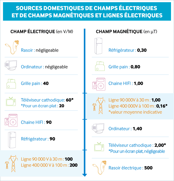Tout appareil ou équipement qui produit, transporte ou consomme de l’électricité génère des champs électriques et magnétiques de même fréquence que celle du réseau électrique : 50 Hz. Les sources de champs sont donc très nombreuses et l’exposition nulle n’existe pas dans notre environnement moderne.