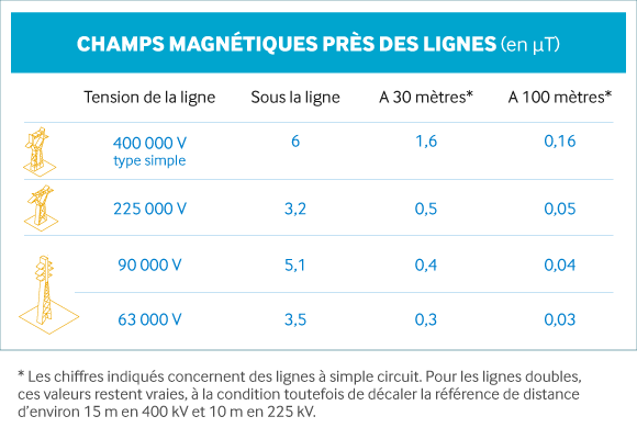 Sous une ligne électrique très haute tension à 400 000 volts, c’est-à-dire les ouvrages électriques qui transitent les plus fortes puissances, le champ moyen est de l’ordre de 6 µT. De plus, il décroit rapidement avec la distance pour tomber à moins de 2 µT à 30 mètres de la ligne, puis à moins de 0,2 µT à 100 mètres.
