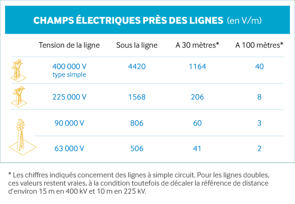 Pour les champs électriques, la valeur limite d’exposition a été fixé à 5 000 volts par mètre (V/m). A l’aplomb d’une ligne très haute tension 400 000 volts, la valeur du champ électrique peut atteindre des valeurs de l’ordre de 4 500 V/m. A 30 mètres, il est de 1 000 V/m et à 100 mètres de 50 V/m.